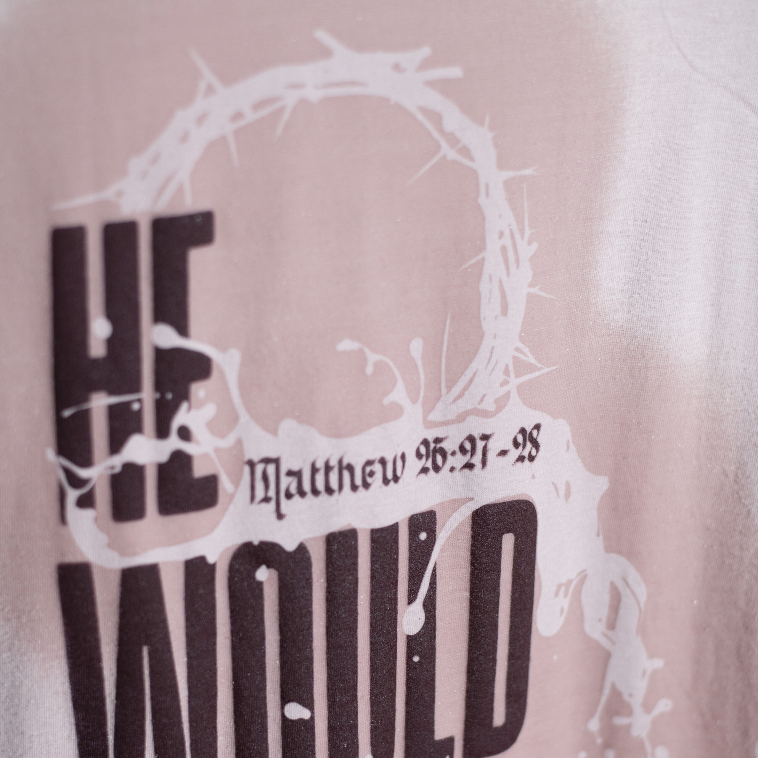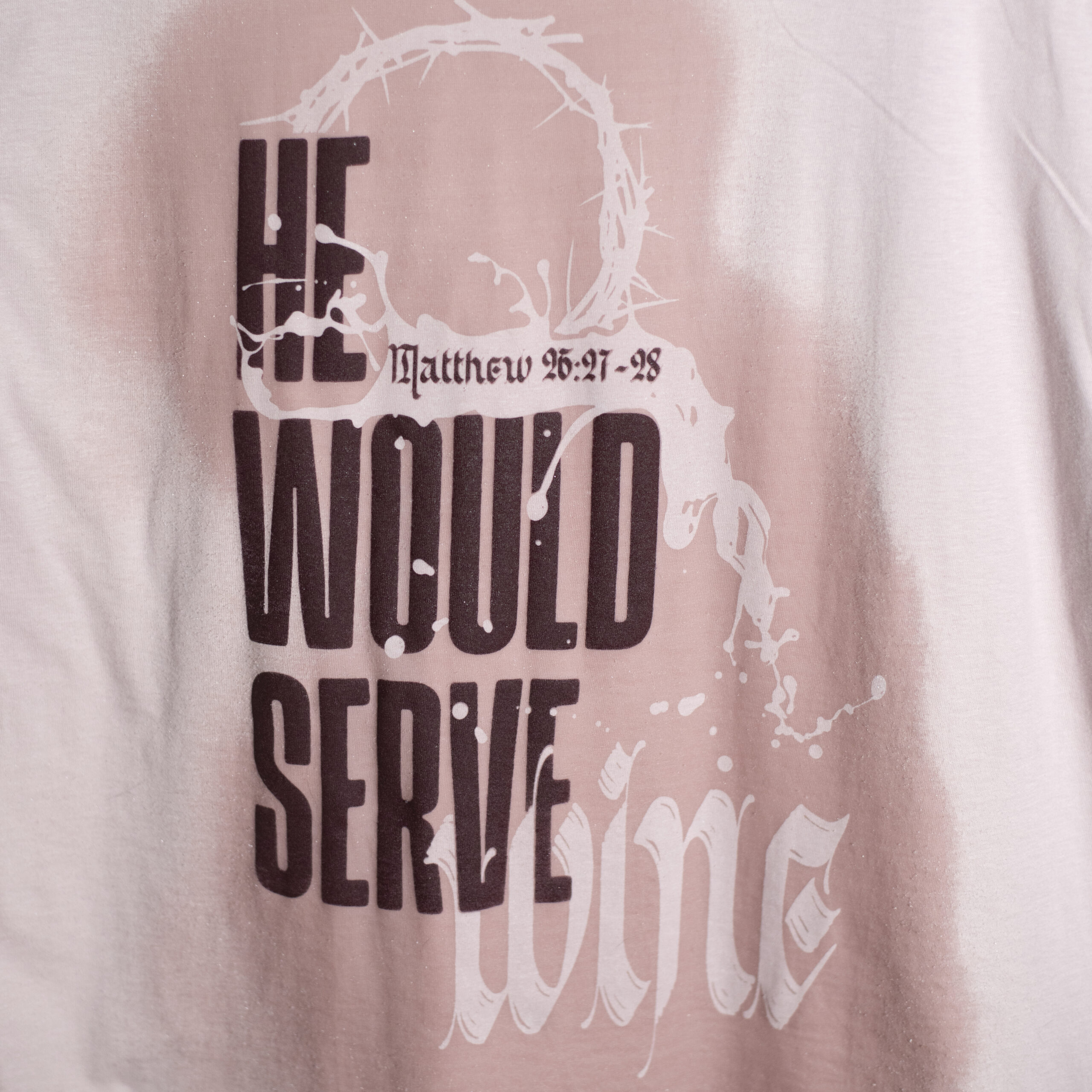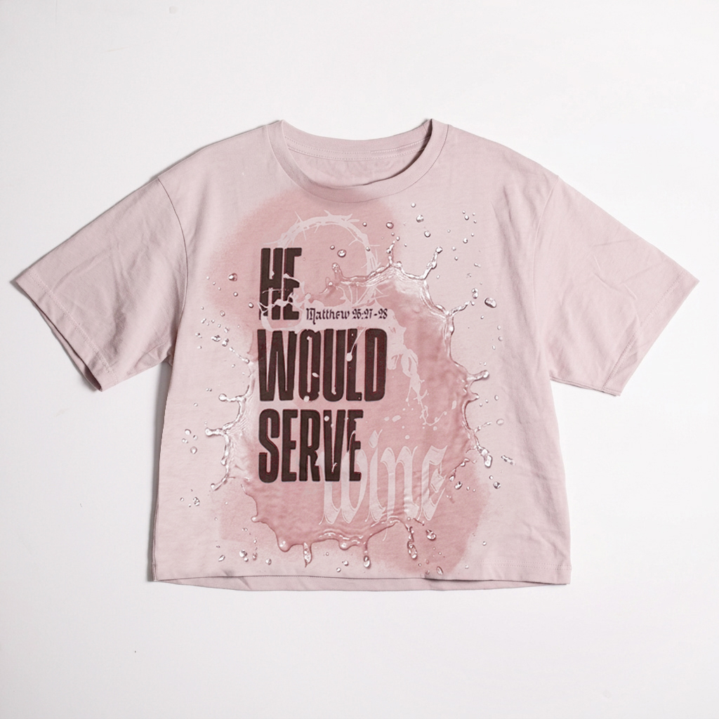 This water-activated design opens with a declaration and reveals the full story when it gets wet — a crown of thorns, blood and wine pouring into the word WINE, transforming the shirt into a reminder that what He served that night at the table was the cup He would drink completely, so we never had to.