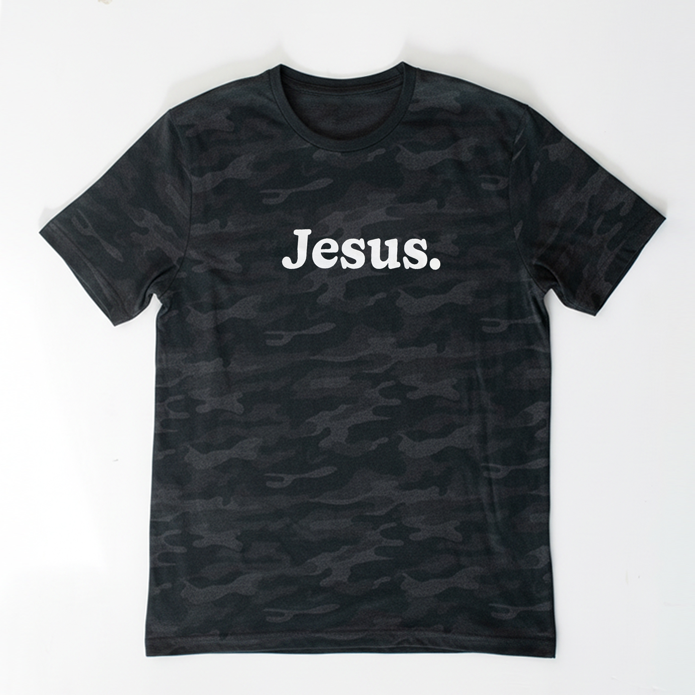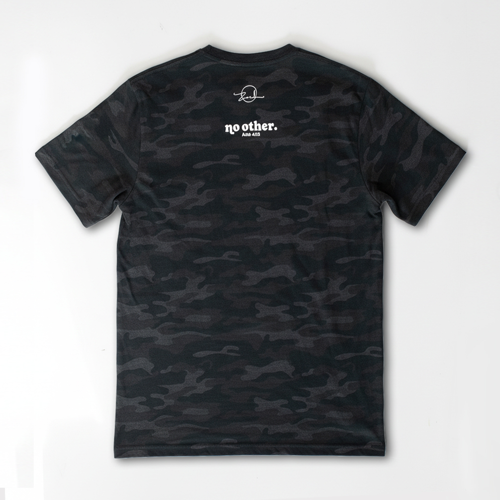 This version pairs understated black camo with a glow-in-the-dark print — visible even when the lights go out. The message remains the same: Jesus. No other name.